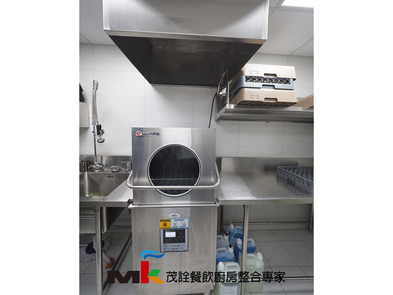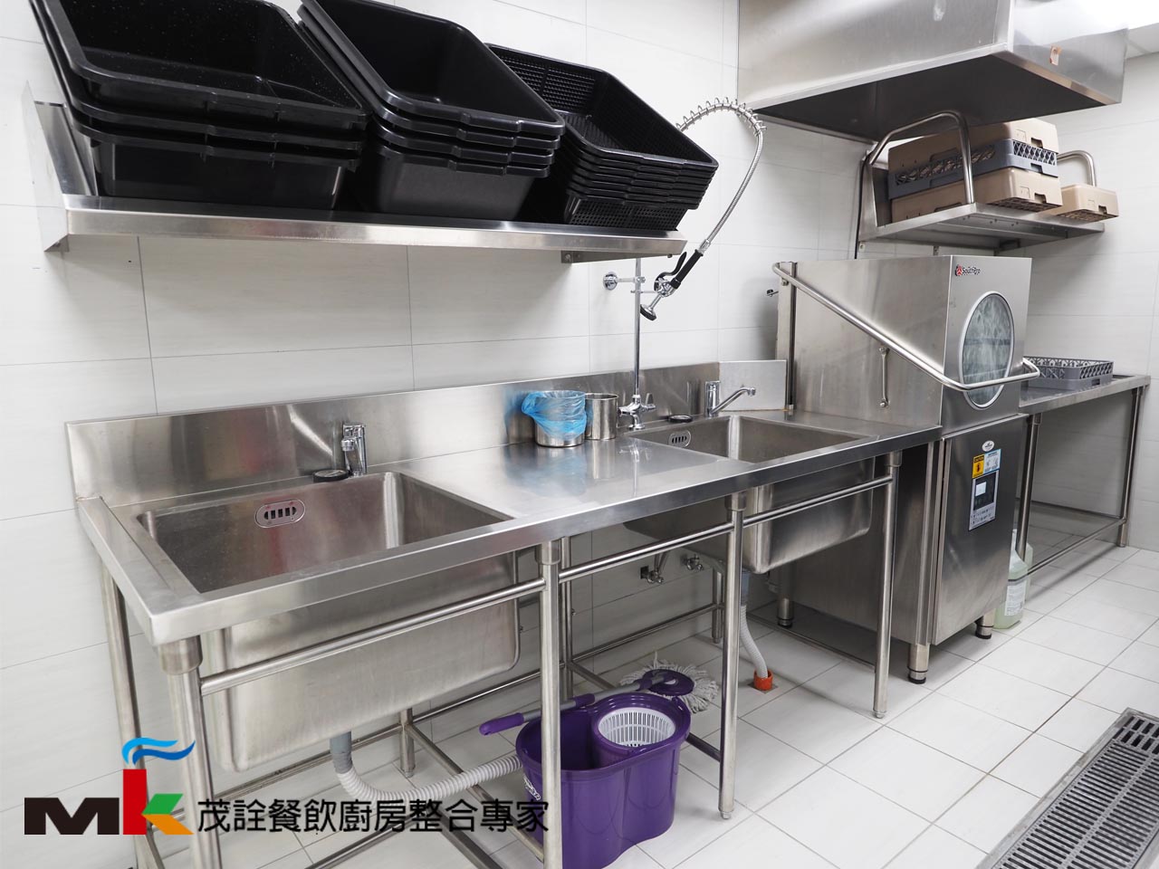 《洗碗區》洗碗機前工作台/雙水槽、碗籃壁架、預洗噴槍、掀門式洗碗機、洗碗機排汽罩
