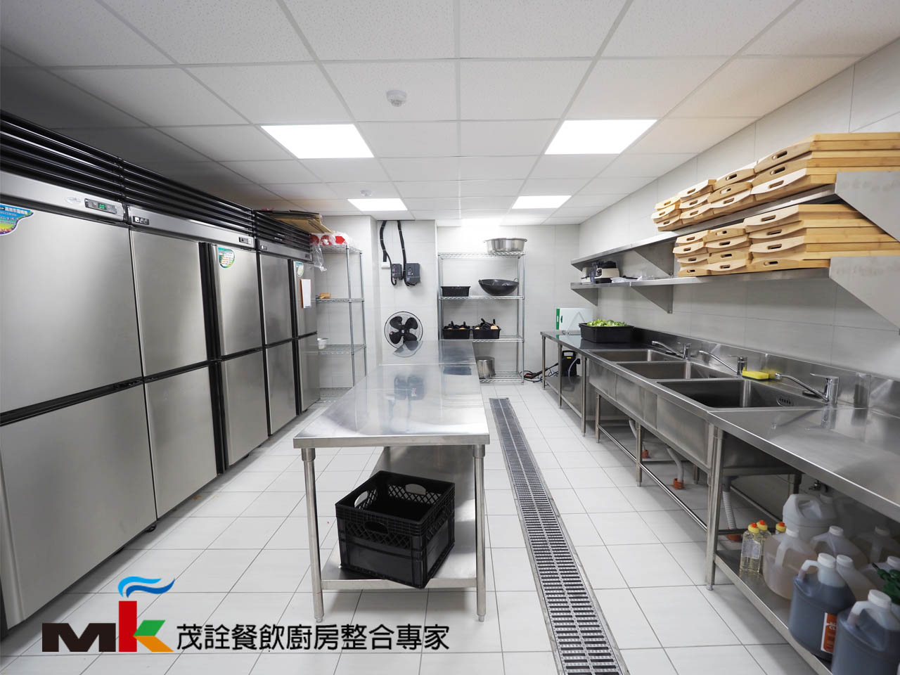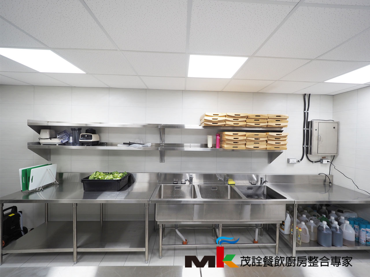 《處理區》刀具消毒櫃、三連水槽、工作台/下層板、雙層上架