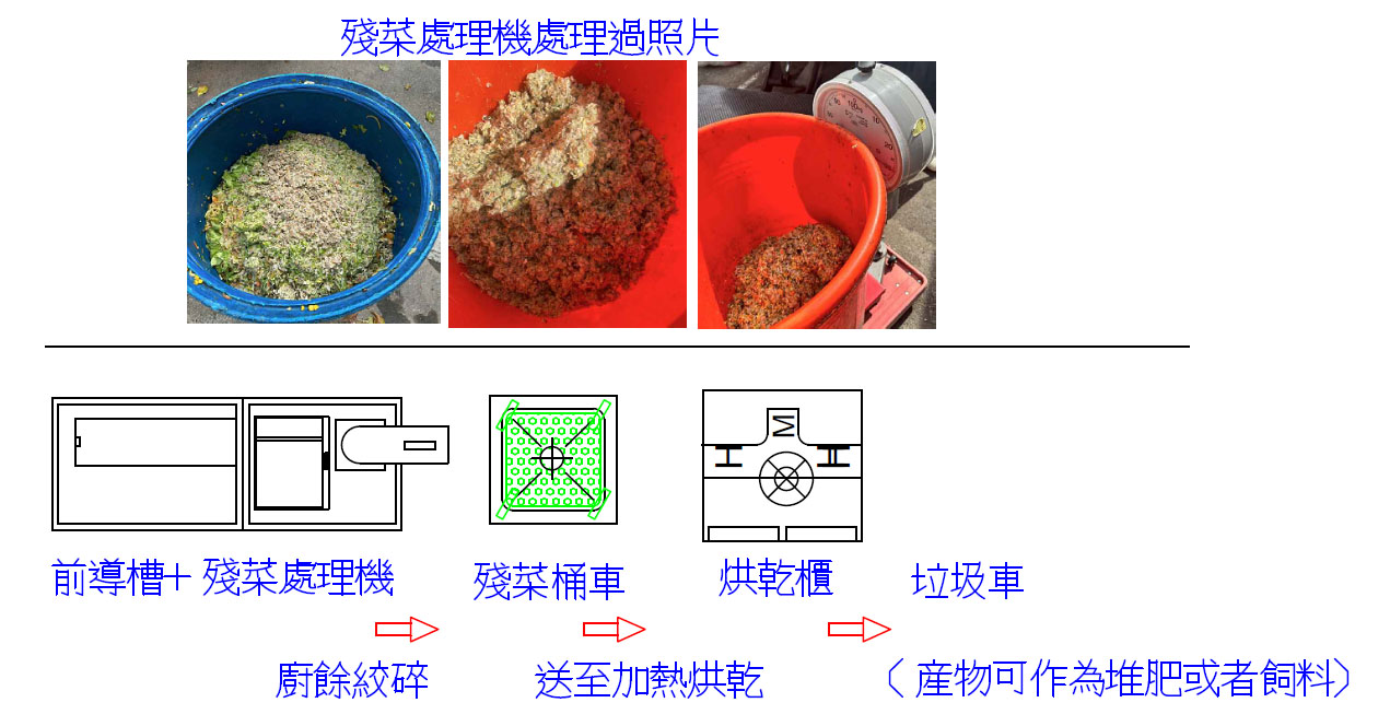 在廚餘丟棄前,需先經由廚餘處理破碎、脫水後變成乾性垃圾以減少殘菜體積及臭味。